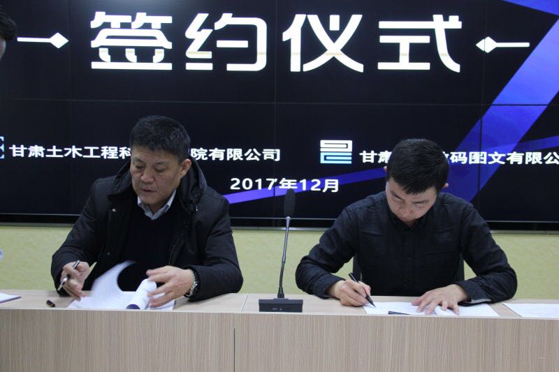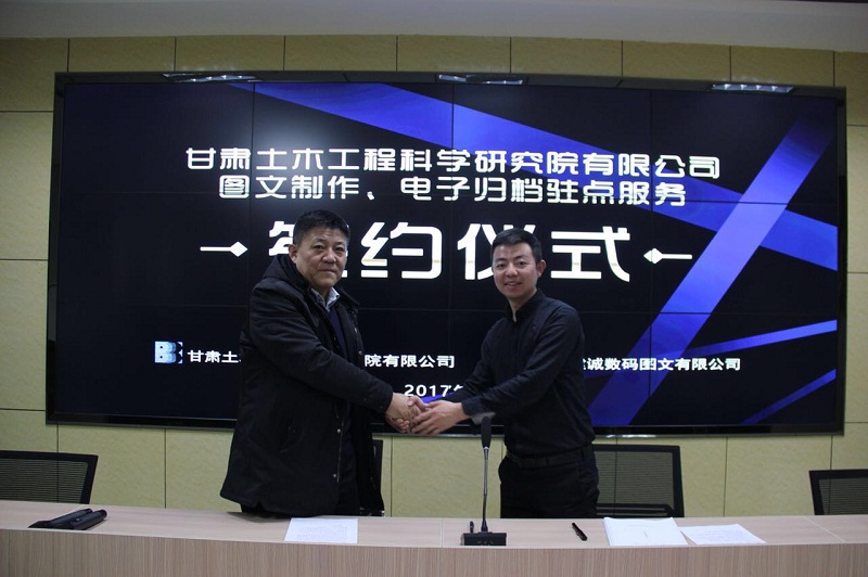 2017年12月19日鄭建軍(jun) 副院長與(yu) 甘肅建誠數碼圖文有限公司負責人在我公司學術報告會(hui) 議廳共同簽署了《圖文製作、電子歸檔駐點服務》合同。