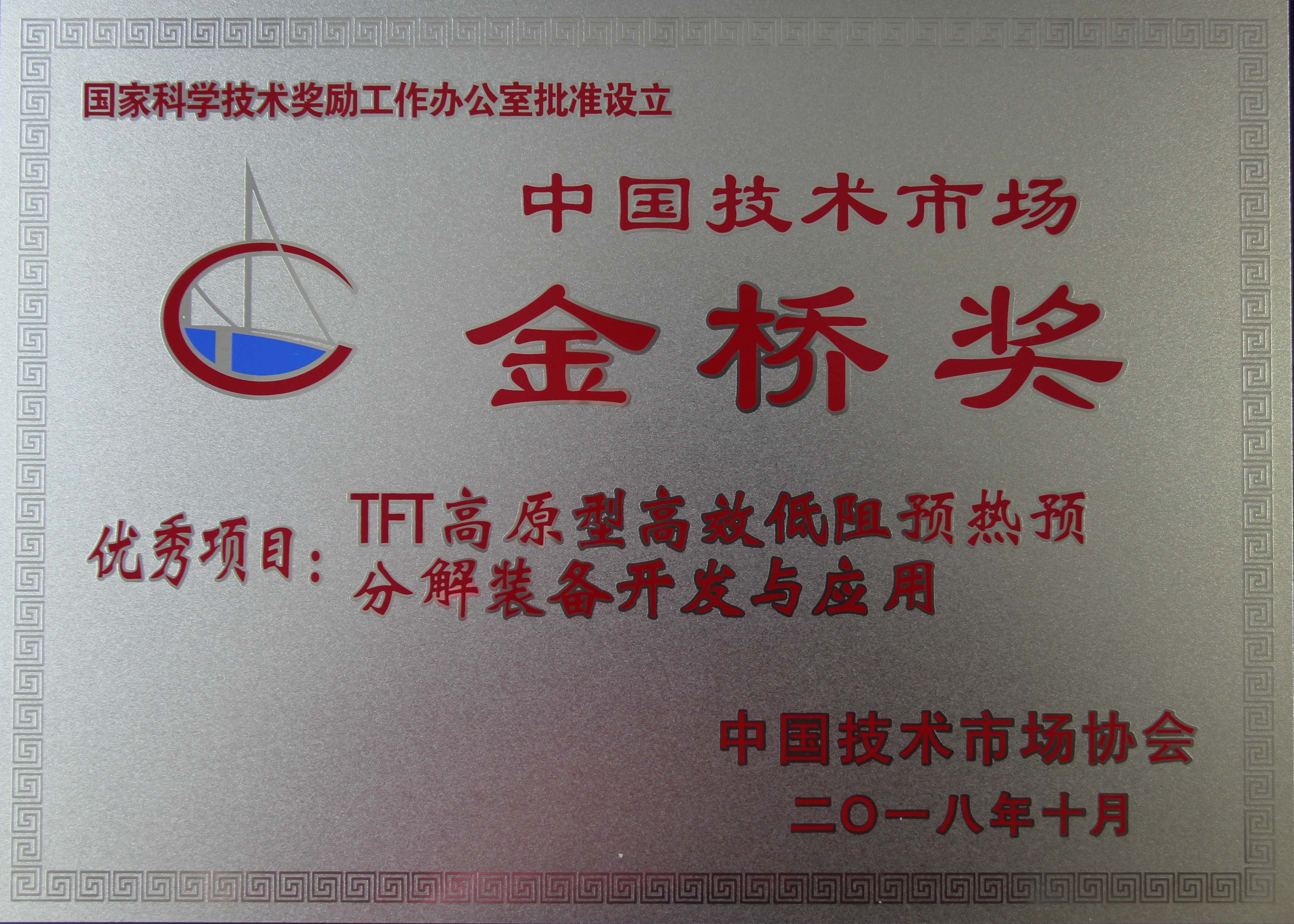 第九屆中國技術市場協會(hui) 金橋獎頒獎大會(hui) 於(yu) 2018年10月31日在北京召開,我公司繼上屆榮獲先進集體(ti) 獎後,今年申報的“TFT高原型高效低阻預熱預分解裝備開發與(yu) 應用”項目經第九屆中國技術市場協會(hui) 金橋獎評審委員會(hui) 評審,榮獲優(you) 秀項目獎。