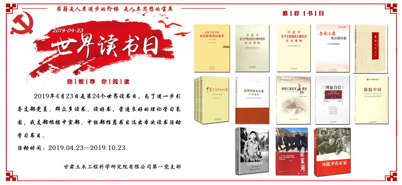 2019年4月23日適逢第24個(ge) 世界讀書(shu) 日,為(wei) 了進一步引導支部黨(dang) 員、群眾(zhong) 多讀書(shu) 、讀好書(shu) ,營造良好的理論學習(xi) 氛圍,我支部根據中宣部、中組部推薦書(shu) 目選出本次讀書(shu) 活動學習(xi) 書(shu) 目。