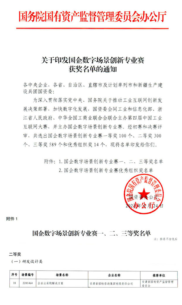 近日,國務院國資委公布了首屆“國企數字場景創新專(zhuan) 業(ye) 賽”獲獎名單。甘肅工程谘詢集團組織推薦的“甘招企業(ye) 雲(yun) 采購平台”創新場景,在全國2007家參賽企業(ye) 推薦的3277個(ge) 場景中脫穎而出,榮獲二等獎!