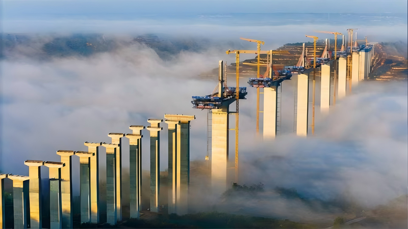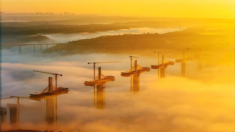 晨光初現,建設中的橋梁在薄霧中若隱若現,跨越河流、連接兩(liang) 岸,為(wei) 隴東(dong) 大地經濟騰飛插上翅膀。
