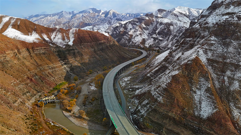 冬日的西營河12號特大橋宛如一條銀龍,蜿蜒於(yu) 銀裝素裹的山巒之中。路,走向更遠的遠方。