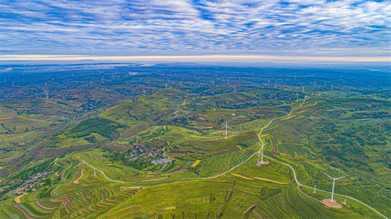 梯田蜿蜒起伏,村莊錯落有致,雲(yun) 海連綿不絕,風車悠然旋轉,織就了人與(yu) 自然和諧共生的美麗(li) 畫卷。