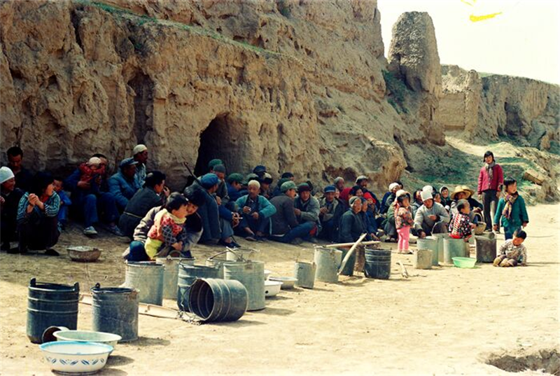 上世紀70年代,甘肅中部的定西等十多個(ge) 縣大旱,數百萬(wan) 群眾(zhong) 等待政府送水(來源:甘肅省水利廳網站)